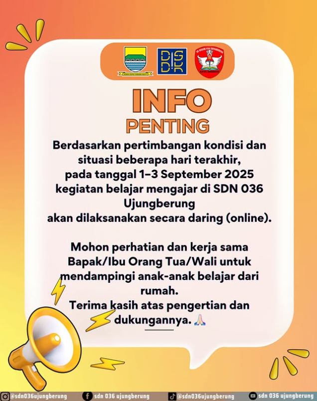 Berdasarkan pertimbangan kondisi dan situasi beberapa hari terakhir,pada tanggal 1β3 September 2025kegiatan belajar mengajar di SDN 036 Ujungberungakan dilaksanakan secara daring (online). Mohon perhatian dan